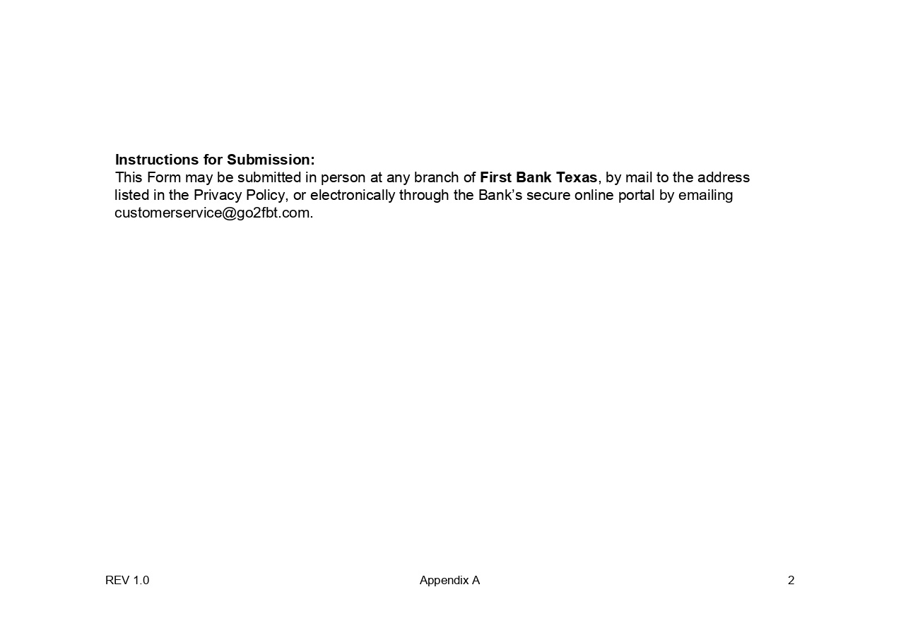 The First National Bank and Trust Company of Weatherford, dba First Bank Texas, welcomes your comments regarding this Statement of Privacy. If you believe that the Bank has not adhered to this Statement, please contact us at customerservice@go2fbt.com. We will use commercially reasonable efforts to promptly investigate and resolve the issue.